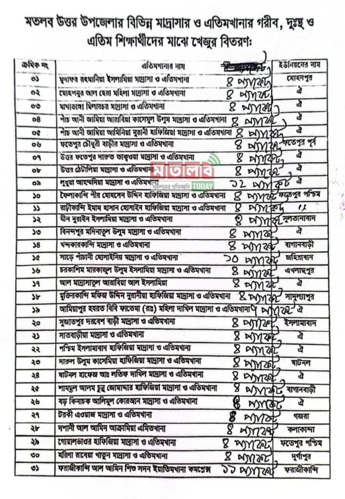 চাঁদপুরের মতলব উত্তরে পবিত্র রমজান মাস উপলক্ষে সৌদি আরবের মানবিক সহায়তা হিসেবে পাওয়া খেজুর ৬১ মাদরাসা ও এতিমখানায় বিতরণ করা হয়েছে।