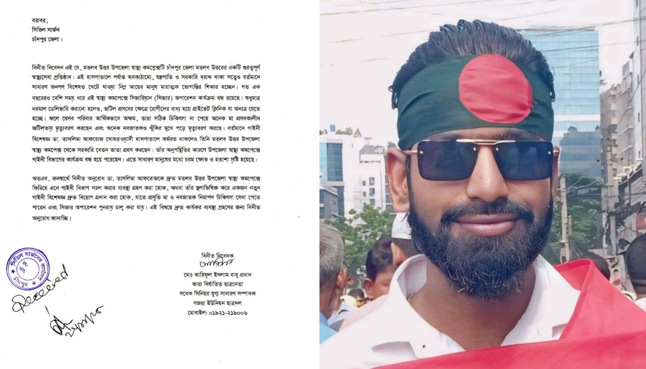 মতলব উত্তর উপজেলা স্বাস্থ্য কমপ্লেক্সে গাইনী বিশেষজ্ঞ ডাক্তার ফেরানোর দাবিতে জেলা সিভিল সার্জন বরাবর দরখাস্ত করেছেন ছাত্রদল নেতা মো. আরিফুল ইসলাম বাবু।