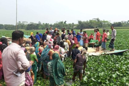 মতলবে কোমর পানিতে দাঁড়িয়ে ঈদের চাল নিচ্ছে দরিদ্ররা